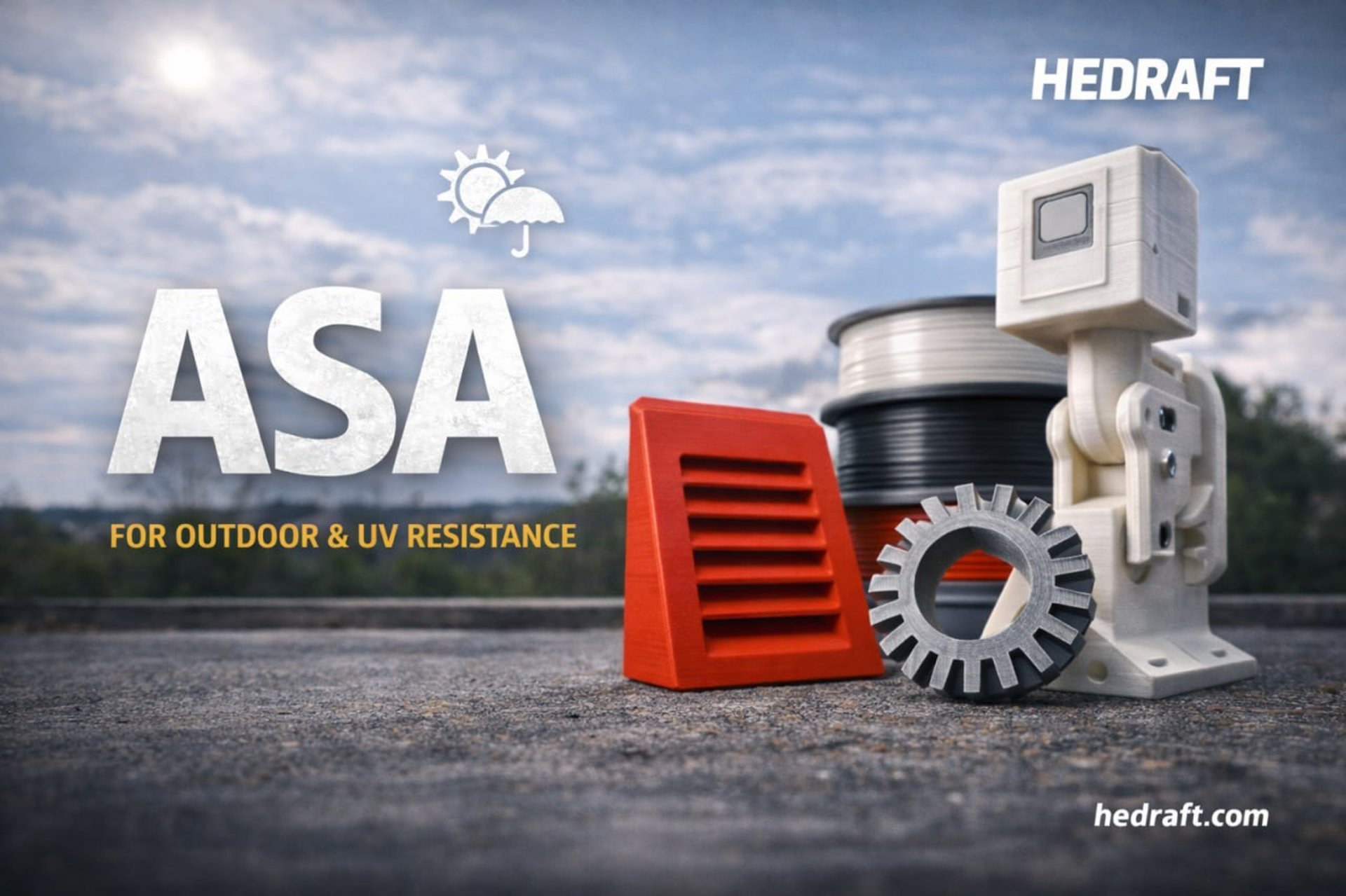 ASA — инженерный пластик для наружного применения: он лучше переносит солнце (UV), погодные условия и влажность. В HEDRAFT мы печатаем из ASA крепления, корпуса и технические детали, которые должны работать на улице или во влажной среде, сохраняя внешний вид и геометрию.