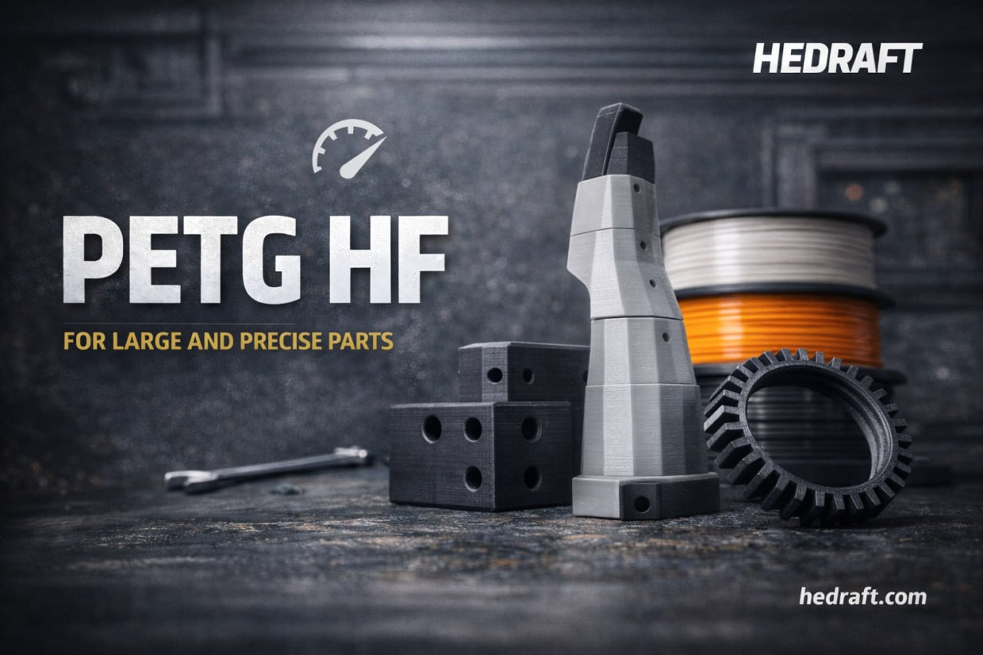 PETG HF — это PETG с упором на стабильную и быструю печать, особенно на крупных моделях. В HEDRAFT мы используем PETG HF для больших корпусов, габаритных деталей и серий, когда важны геометрия, повторяемость и сроки изготовления.