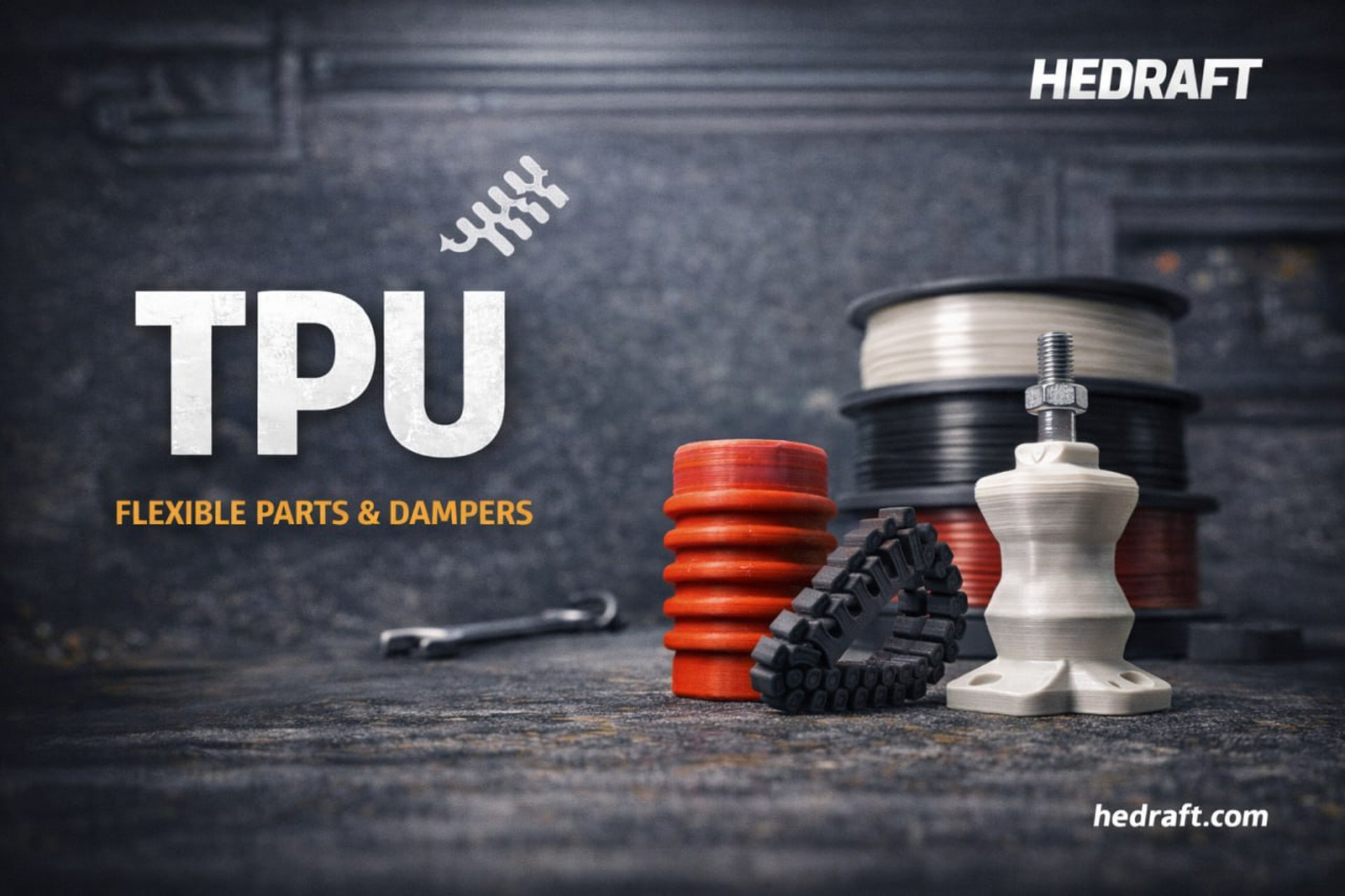 TPU — эластичный материал для 3D-печати, похожий по поведению на резину. В HEDRAFT мы печатаем из TPU демпферы, накладки, уплотнения и защитные элементы — там, где нужна гибкость, амортизация и устойчивость к износу.